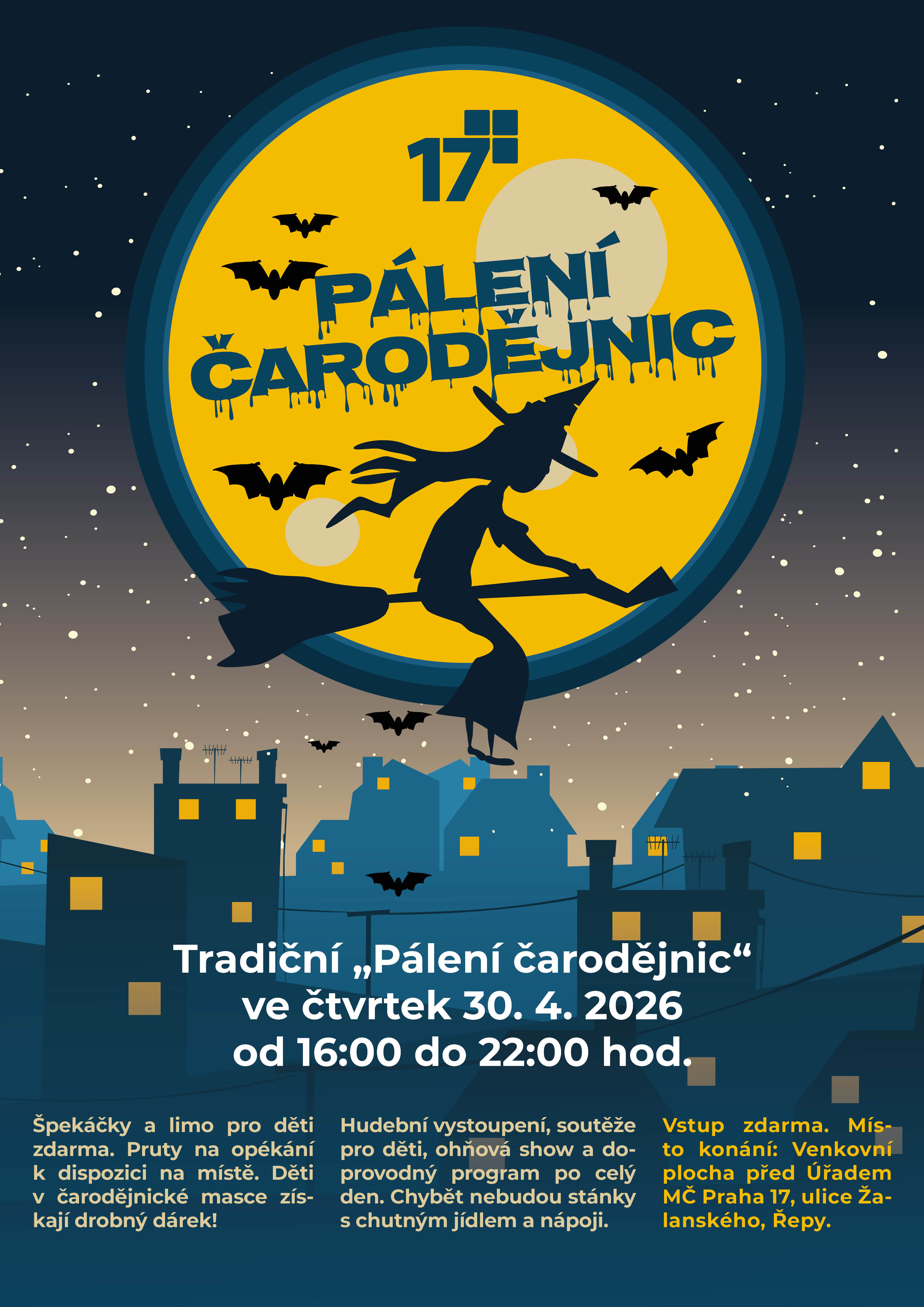 Tradiční akci Pálení čarodějnic pořádá MČ Praha 17 ve spolupráci s Kulturním centrem Průhon. Akce proběhne ve čtvrtek 30. 4. 2026 od 16:00 do 22:00 hod na louce před úřadem MČ Praha 17, ulice Žalanského, Řepy.