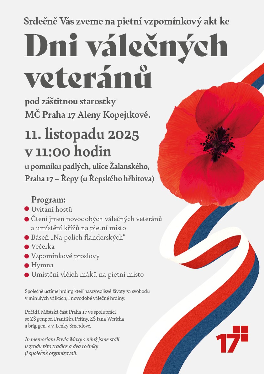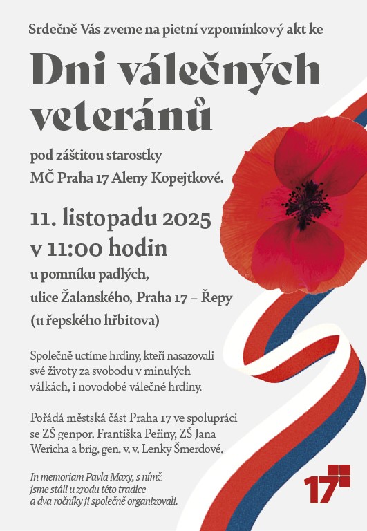 Srdečně Vás zveme na pietní vzpomínkový akt ke Dni válečných veteránů pod záštitou starostky Městské části Praha 17 Aleny Kopejtkové