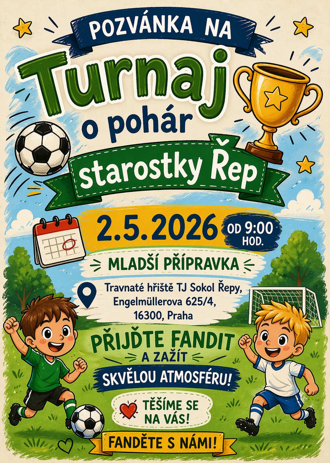 TJ Sokol Řepy pořádá v sobotu 2. 5. 2026 fotbalový Turnaj o pohár starostky Řep pro mladší přípravky (ročníky 2017 a 2018). Přijďte fandit a zažít skvělou atmosféru.